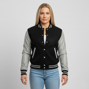 Celebrate school spirit in style with the premium black and gray college varsity jacket for women. Crafted for durability and elegance, this jacket is ideal for games, pep rallies, campus events, or casual fashion statements. Its high-quality materials, flattering fit, and versatile design make it a must-have for varsity lovers and trendsetters alike.