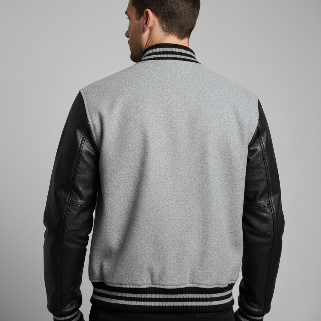 Not sure how to choose a quality grey and black letterman jacket? This jacket features a structured wool body with durable leather sleeves, delivering warmth, comfort, and long-lasting wear.