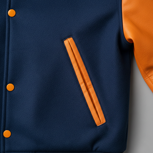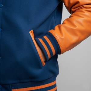 This fashionable blue and orange varsity jacket for school and streetwear bridges classic varsity heritage with modern style, perfect for students and fans.