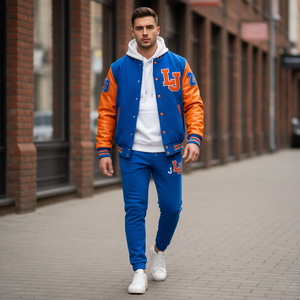 Designed as a comfortable blue and orange letterman jacket for layering, it pairs effortlessly with hoodies, tees, or sweaters for versatile daily wear.