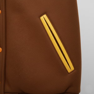 H3: Custom Embroidered Brown and Yellow Varsity Jacket