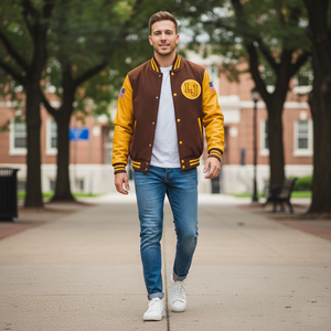 Add a personal touch with a custom embroidered brown and yellow varsity jacket, featuring your initials or graduation year for a unique keepsake.