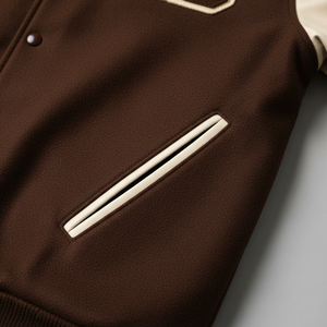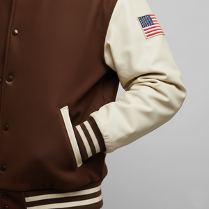 Featuring vintage brown varsity jacket with leather sleeves, the high-quality material adds durability, texture, and authentic varsity style.