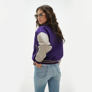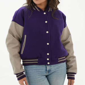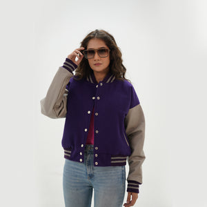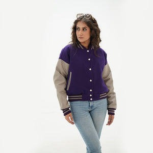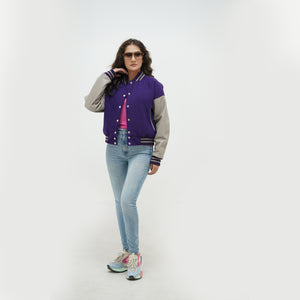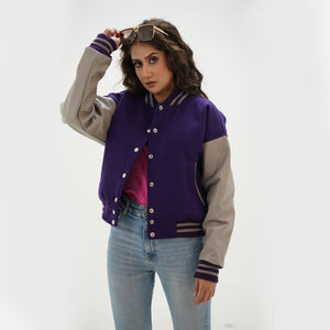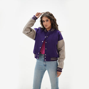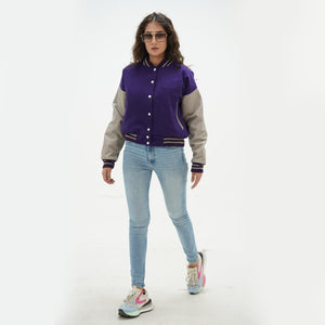 Girls Purple And Gray Letterman Jacket Leather Arms And Wool Body Is Made Of Premium Melton Wool, While The Jacket Sleeves Are Made Of Premium Geniune Leather. This Varsity Jacket Comes With Purple Wool Body, Gray Leather Sleeves And Purple Rib With Grey Stripes.