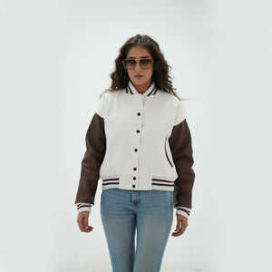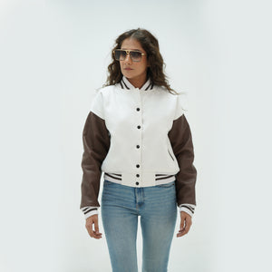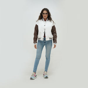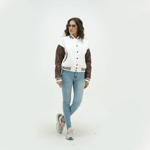 Women's Letterman Varsity Jacket White Wool Body And Chocolate Brown Leather Arms