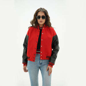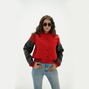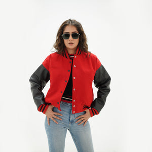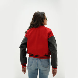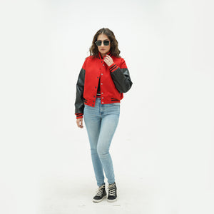 Women's Red And Black Varsity Jacket Leather Arms And Wool Body Is Made Of Premium Melton Wool, While The Jacket Sleeves Are Made Of Premium Geniune Leather. This Varsity Jacket Comes With Red Wool Body, Black Leather Sleeves And Red Rib With Black Stripes.