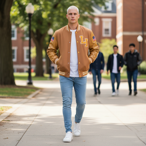Show your school pride with the Brown Wool Varsity Jacket with Gold Leather Sleeves, a timeless letterman jacket that combines style, comfort, and durability. Crafted with a premium wool body and genuine leather sleeves, this jacket offers warmth and long-lasting quality. Perfect for campus events, sports games, or casual streetwear, the rich brown and gold colorway makes a bold statement while honoring classic varsity traditions.