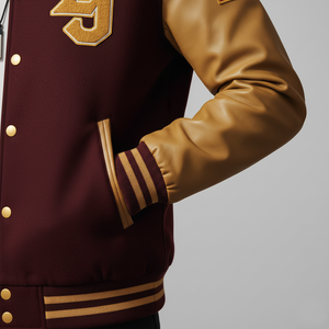 Show off your school spirit with the Burgundy Wool Varsity Jacket with Gold Leather Sleeves, blending classic varsity design with modern comfort. Crafted with a premium wool body and genuine leather sleeves, this jacket delivers durability, warmth, and style. Perfect for campus events, cheering on your team, or casual streetwear, the bold burgundy and gold colors make a statement while honoring traditional letterman aesthetics.