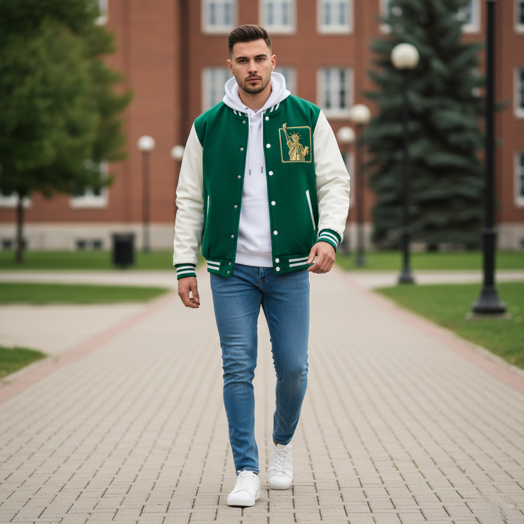Bring varsity heritage into modern streetwear with this pine green letterman jacket streetwear-ready design. The clean silhouette and refined details make it perfect for everyday city wear, social outings, or casual events.