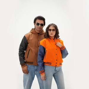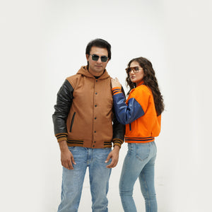 Brown And Black Letterman Jacket Is Made Of Premium Melton Wool, While The Jacket Sleeves Are Made Of Premium Geniune Leather. This Varsity Jacket Comes With Brown Wool Body, Brown Leather Sleeves And Black Stripes.