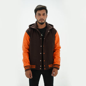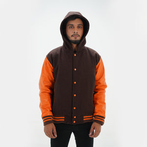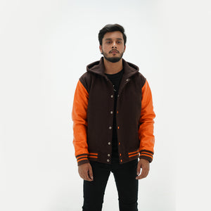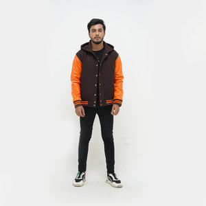 Chocolate Brown Body And Old Gold Leather Arms Varsity Jacket With Hoodie