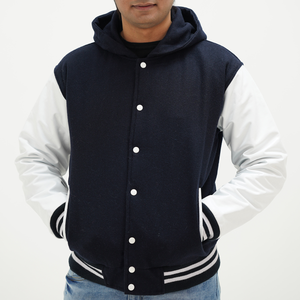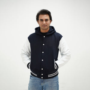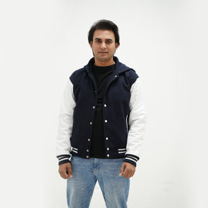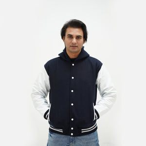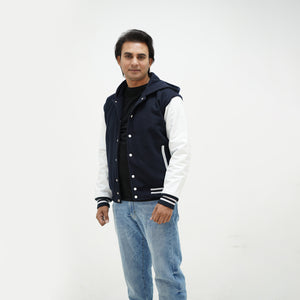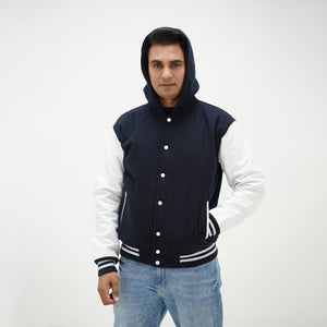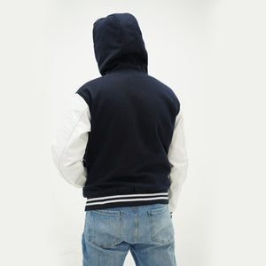 Dark Blue And White Varsity Jacket With Hood Wool Body And Leather Sleeves