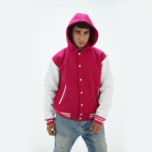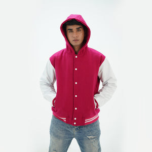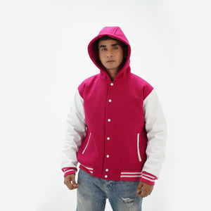Men's Pink And White Letterman Hoodie Jacket Leather Arms And Wool Body Is Made Of Premium Melton Wool, While The Jacket Sleeves Are Made Of Premium Geniune Leather. This Varsity Jacket Comes With Pink Wool Body, White Leather Sleeves And Pink Rib With White Stripes.