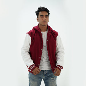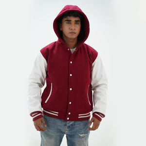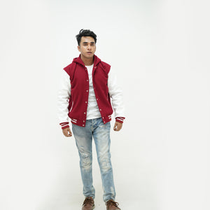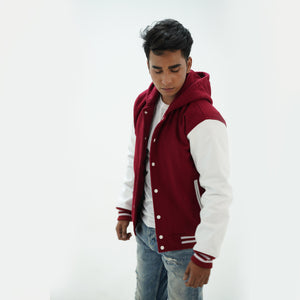 Men's Magenta And White Letterman Hoodie Jacket Wool Body And Leather Arms