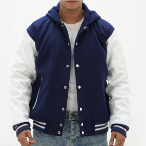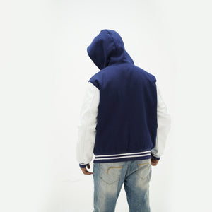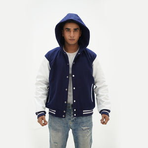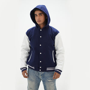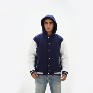 Men's Navy Blue Hooded Varsity Jacket Leather Arms And Wool Body Letterman Jacket