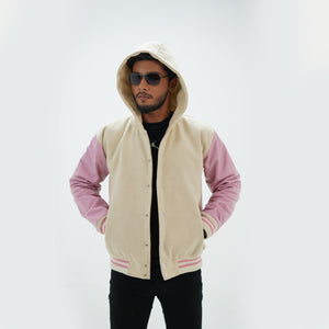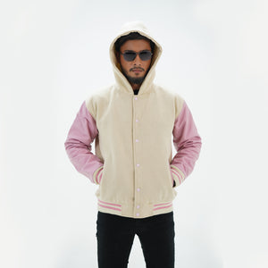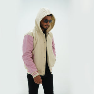 Off White And Pink Varsity Jacket And Hoodie Leather Arms And Wool Body