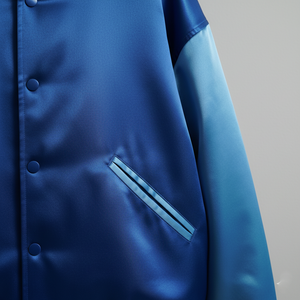 Crafted with a premium satin shell, this men’s satin varsity jacket delivers a sleek, polished look that elevates everyday outfits. -