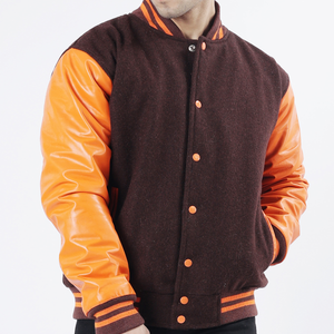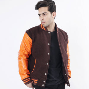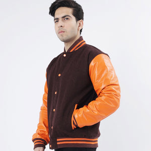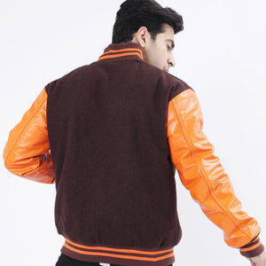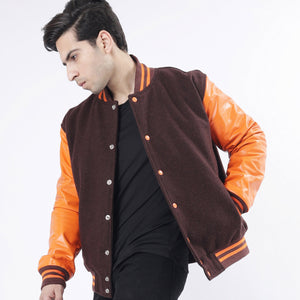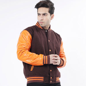 Chocolate Brown Body And Old Gold Leather Arms Letterman Jacket Is Made Of Premium Melton Wool, While The Jacket Sleeves Are Made Of Premium Geniune Leather. This Varsity Jacket Comes With Chocolate Brown Wool Body, Old Gold Leather Sleeves And Chocolate Brown Rib With Old Gold Stripes.