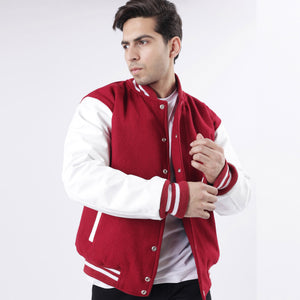 Men's Magenta And White Letterman Jacket Leather Arms And Wool Body Varsity Jacket Is Made Of Premium Melton Wool, While The Jacket Sleeves Are Made Of Premium Geniune Leather. This Varsity Jacket Comes With Magenta Wool Body, White Leather Sleeves And Royal Blue Rib With White Stripes.