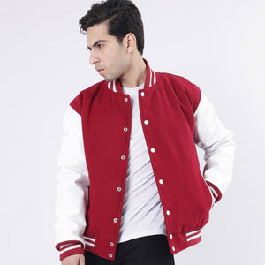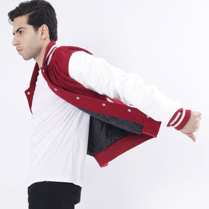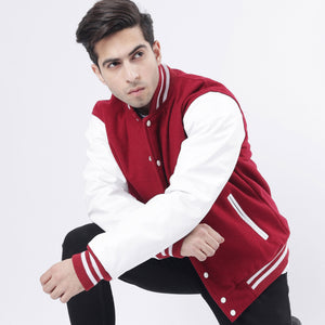 Men's Magenta And White Letterman Jacket Leather Arms And Wool Body Varsity Jacket