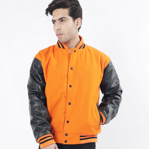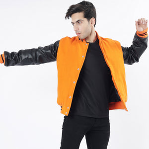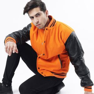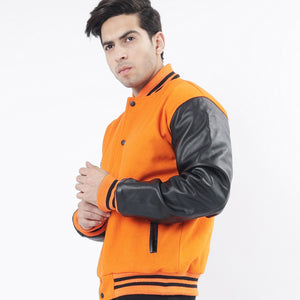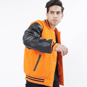 Men's Orange Wool Body And Black Leather Sleeves Varsity Jacket Is Made Of Premium Melton Wool, While The Jacket Sleeves Are Made Of Premium Geniune Leather. This Varsity Jacket Comes With Orange Wool Body, Black Leather Sleeves And Orange Rib With Black Stripes.