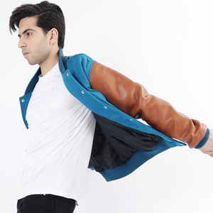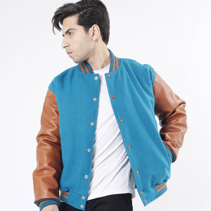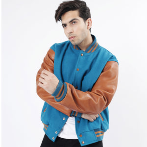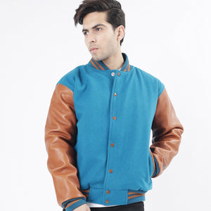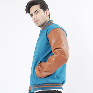 Men's Sky Blue Body And Brown Leather Sleeves Letterman Jacket Is Made Of Premium Melton Wool, While The Jacket Sleeves Are Made Of Premium Geniune Leather. This Varsity Jacket Comes With Sky Blue Wool Body, Brown Leather Sleeves And Sky Blue Rib With Brown Stripes.