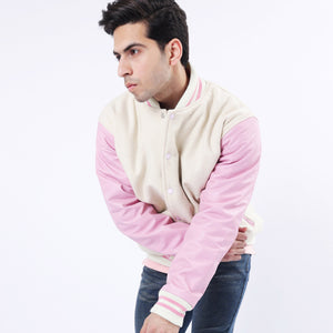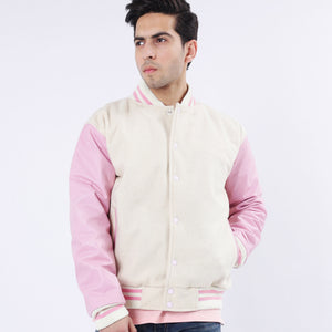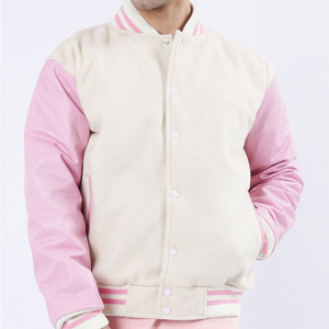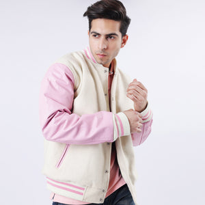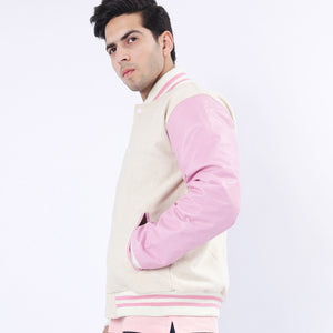 Off White And Pink Letterman Jacket Leather Arms And Wool Body Varsity Jacket Is Made Of Premium Melton Wool, While The Jacket Sleeves Are Made Of Premium Geniune Leather. This Varsity Jacket Comes With Off White Wool Body, Pink Leather Sleeves And Off White Rib With Pink Stripes.