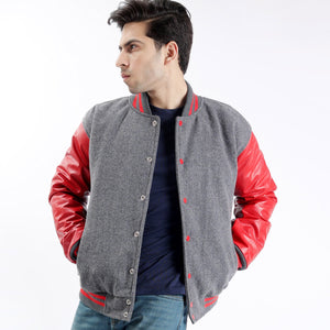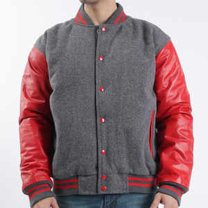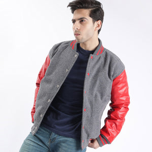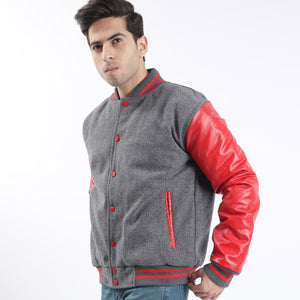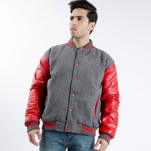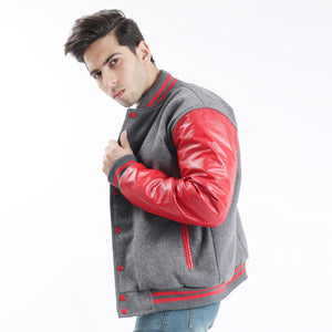 Seniors Letterman Jacket Grey And Red Leather Sleeves Wool Body Varsity Jacket Is Made Of Premium Melton Wool, While The Jacket Sleeves Are Made Of Premium Geniune Leather. This Varsity Jacket Comes With Grey Wool Body, Red Leather Sleeves And Grey Rib With Red Stripes.