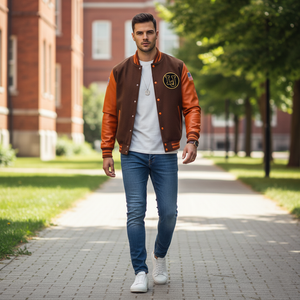 Step out in style with the color-block varsity design. The bold brown and orange combination makes a statement while remaining versatile enough to layer over hoodies or casual attire. Perfect for streetwear lovers, students, and trendsetters, this jacket merges varsity tradition with modern fashion trends, ensuring you look confident and stylish wherever you go.