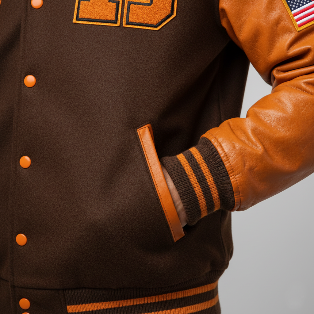 Combine classic varsity charm with modern color-block streetwear style. The brown and orange design elevates campus fashion, casual outfits, and fan apparel, making it perfect for everyday wear or events.