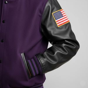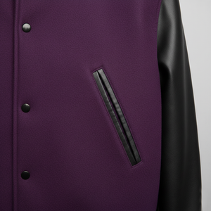 Crafted with a black and purple varsity jacket with leather sleeves, this design ensures durability, structure, and long-lasting wear. The wool body provides warmth while leather sleeves add a premium varsity finish.