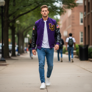 Make a bold statement with a black and purple letterman jacket that blends iconic American varsity tradition with modern streetwear appeal. Designed for college students, fans, and style-driven buyers, this jacket delivers premium materials, eye-catching contrast, and all-day comfort. Whether you’re heading to campus, game day, or a night out, this varsity jacket adds confidence to every outfit.