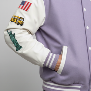 Personalize your jacket with custom embroidery options for a light purple letterman jacket, including initials, numbers, or patches. A great choice for college teams, fans, and coordinated group looks.