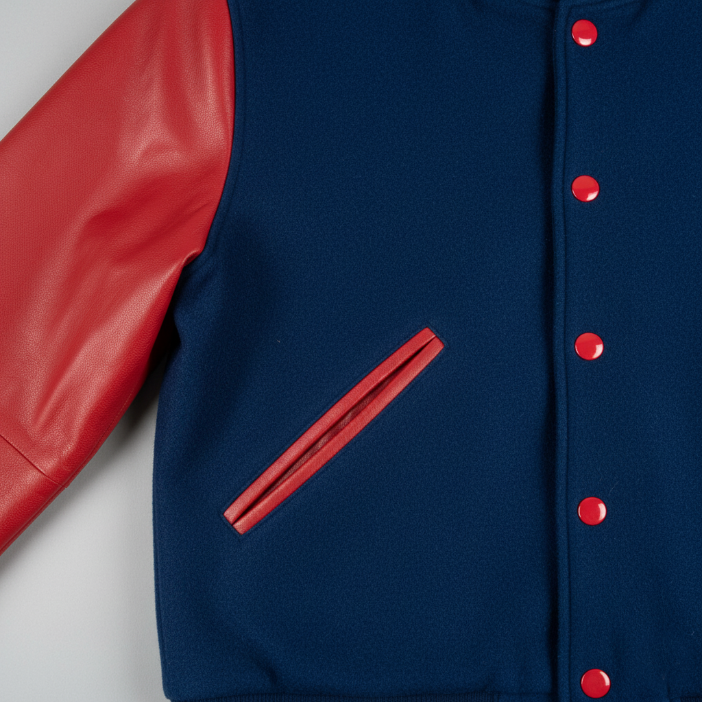 A: Made from premium wool and leather Blue and Red Varsity Jacket, ensuring warmth, durability, and authentic varsity look.