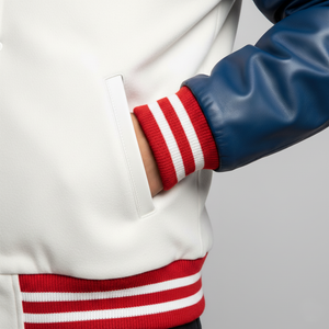 Red & White Letterman Jacket With Blue Accents For Men Varsity