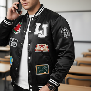 Elevate your varsity wardrobe with a premium custom satin bomber jacket featuring patches. Choose from varsity stripes, school logos, or personalized designs. High-quality embroidery and satin fabric ensure your jacket is not only stylish but built to last through seasons of wear.