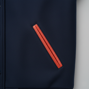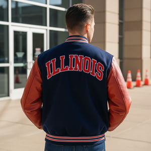Show off true Fighting Illini spirit with our authentic University of Illinois varsity bomber jacket. Featuring the classic team colors of navy and orange, it combines durability with fashion-forward design. Perfect for alumni, students, and fans, this jacket ensures you represent Illinois with pride, whether at the stadium or on the streets.