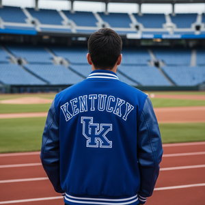 Show off your Kentucky Wildcats pride with this premium varsity jacket, featuring a wool body, vibrant royal blue and white colors, and classic embroidered chenille letters. Perfect for students, alumni, or die-hard fans, this jacket balances timeless varsity tradition with modern comfort—ideal for game days, campus events, or casual everyday wear.