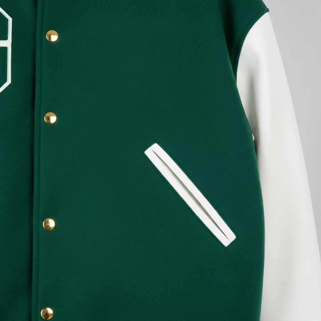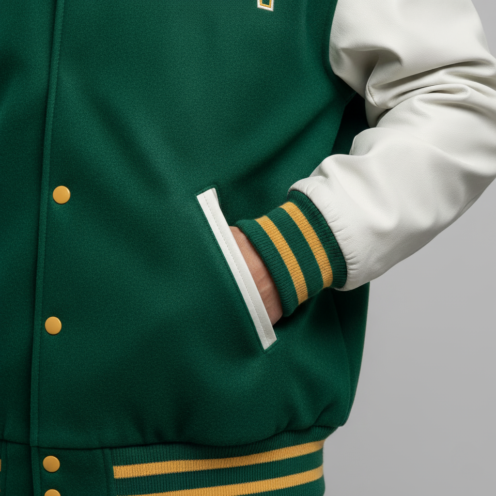 Crafted with a wool body and genuine leather sleeves, this jacket addresses common material quality concerns. Durable, warm, and stylish, it’s built to last while representing your school or team pride.