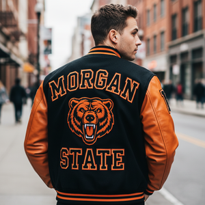 Show off your Morgan State pride with this official Letterman Jacket, featuring premium embroidered Bears logos and varsity patches. Perfect for game days, alumni events, tailgates, or casual streetwear, this jacket combines classic collegiate style with durable craftsmanship, making it a must-have for fans, students, and alumni alike.