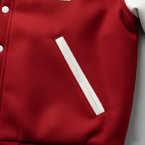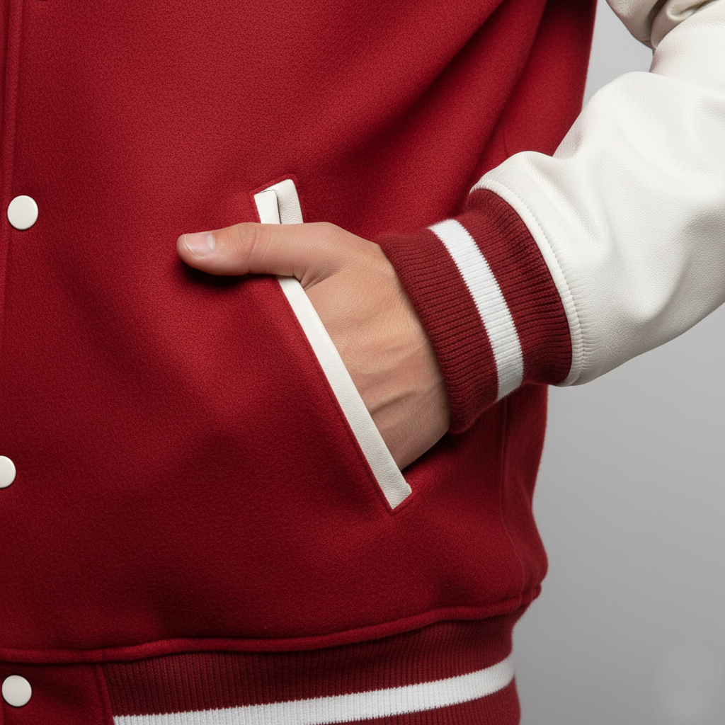 A: Crafted with a wool body and genuine leather sleeves, it provides durability, warmth, and classic varsity aesthetics.