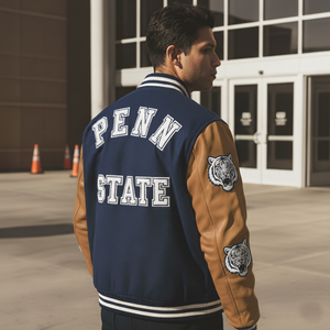 Crafted with a wool body and genuine leather sleeves, this jacket delivers durability, warmth, and style. It addresses the common question, what are the best materials for a Penn State varsity jacket, ensuring a jacket that lasts season after season.