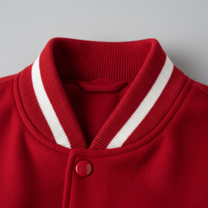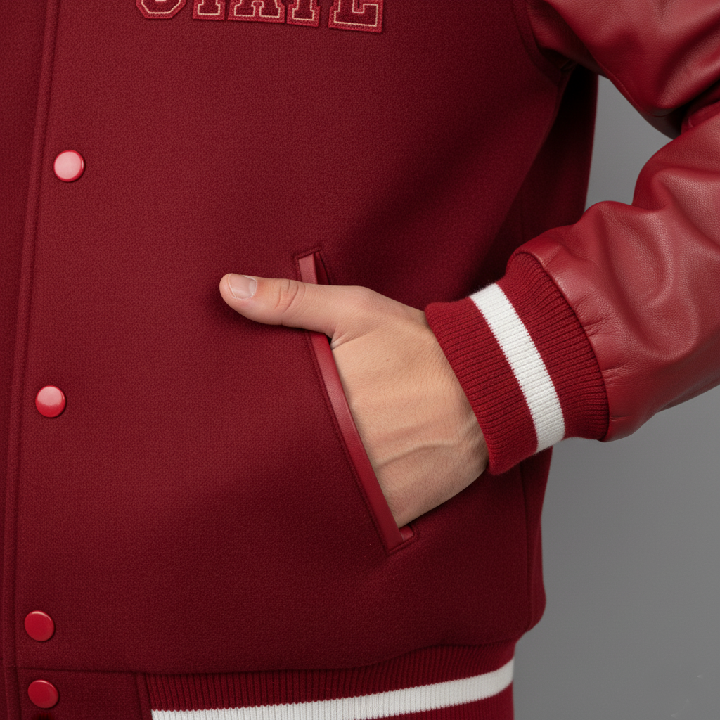 A: This jacket features wool and genuine leather sleeves, combining warmth, durability, and classic varsity style.