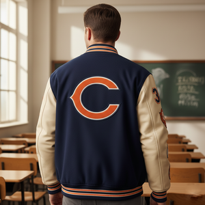 Show your team pride with the Chicago Bears Wool and Leather Varsity Letterman Jacket, crafted for fans who value style, comfort, and authenticity. With a premium wool body and genuine leather sleeves, this jacket blends classic varsity aesthetics with modern streetwear appeal, making it perfect for game days, campus life, or casual outings.