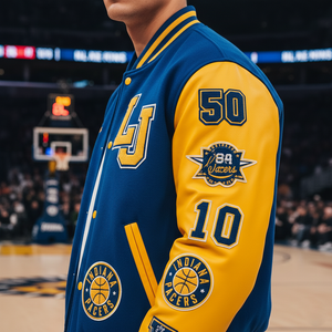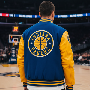 Nothing says team spirit like the blue and yellow Indiana Pacers varsity jacket. Whether you’re cheering courtside or watching from home, its bold color scheme makes you instantly recognizable as a true fan. Lightweight yet durable, it’s ideal for game days, tailgate parties, and casual outings, keeping you warm, comfortable, and stylish.