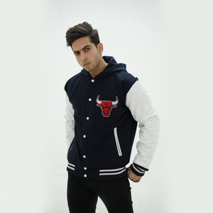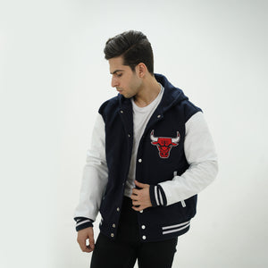 Men's Chicago Bulls Letterman Jacket With Hood Wool Body And Leather Sleeves Is Made Of Premium Melton Wool, While The Jacket Sleeves Are Made Of Premium Geniune Leather. This Varsity Jacket Comes With Dark Blue Wool Body, White Leather Sleeves And Black Stripes Rib With White Stripes.