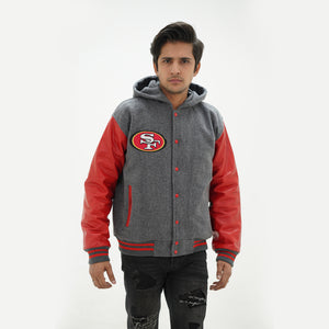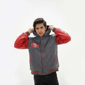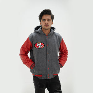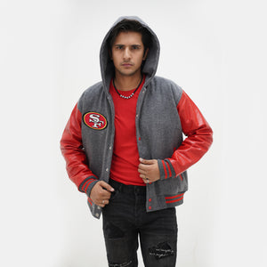 Men's San Francisco 49ers Varsity Jacket Leather Sleeves Wool Body Hoodie Is Made Of Premium Melton Wool, While The Jacket Sleeves Are Made Of Premium Geniune Leather. This Varsity Jacket Comes With Grey Wool Body, Red Leather Sleeves And Grey Rib With Red Stripes.