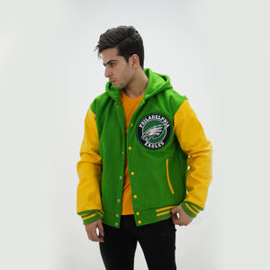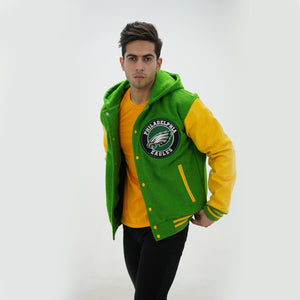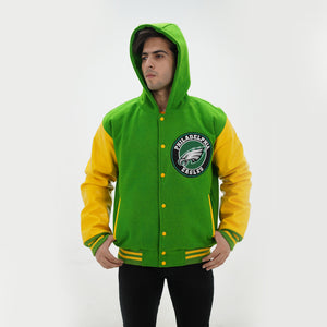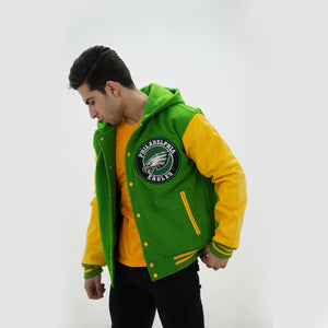 Philadelphia Eagles Letterman Hoodie Jacket For Men Is Made Of Premium Melton Wool, While The Jacket Sleeves Are Made Of Premium Geniune Leather. This Varsity Jacket Comes With Kelly Green Wool Body, Yellow Leather Sleeves And Kelly Green Rib With Yellow Stripes.