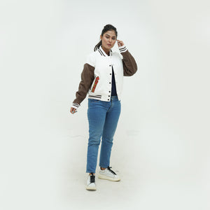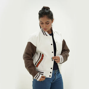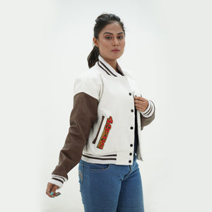 Women 49ers Letterman Jacket White Wool Body And Chocolate Leather Arms Is Made Of Premium Melton Wool, While The Jacket Sleeves Are Made Of Premium Geniune Leather. This Varsity Jacket Comes With White Wool Body, Chocolate Leather Sleeves And White Rib With Chocolate Stripes.