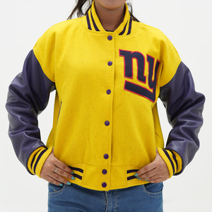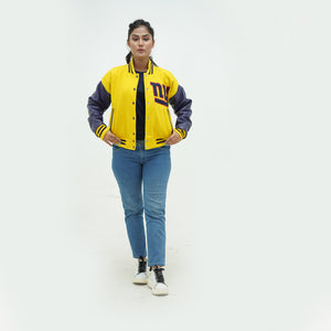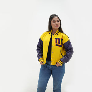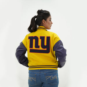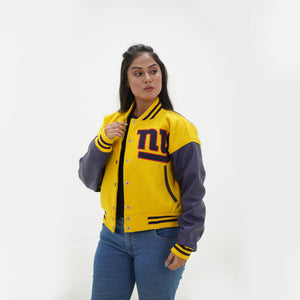 Women New York Giants Varsity Jacket Yellow Wool Body And Purple Leather Arms Is Made Of Premium Melton Wool, While The Jacket Sleeves Are Made Of Premium Geniune Leather. This Varsity Jacket Comes With Yellow Wool Body, Purple Leather Sleeves And Yellow Rib With Purple Stripes.